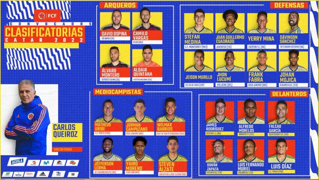 Finalmente el técnico de la Selección Colombia, Carlos Queiroz, dio a conocer la lista de 24 convocados para la primera doble fecha de las eliminatorias al Mundial Catar 2022, en la que el combinado nacional se enfrentará a Venezuela y Chile.