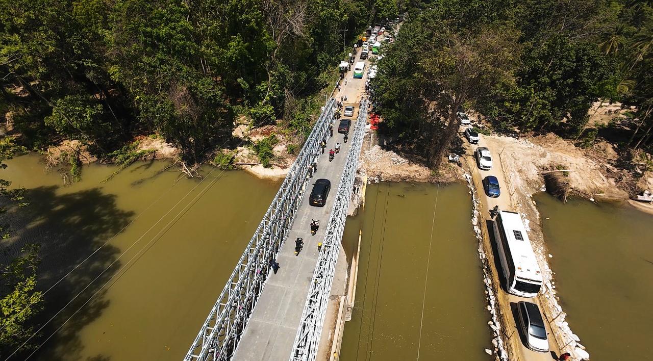 La obra, coordinada por el Gobierno Nacional a través del Instituto Nacional de Vías (Invías), con apoyo del Ejército Nacional y la Unidad Nacional para la Gestión del Riesgo de Desastres (UNGRD), permite nuevamente el tránsito de vehículos particulares, transporte público y carga pesada, gracias a su capacidad de hasta 52 toneladas y una longitud cercana a los 64 metros.