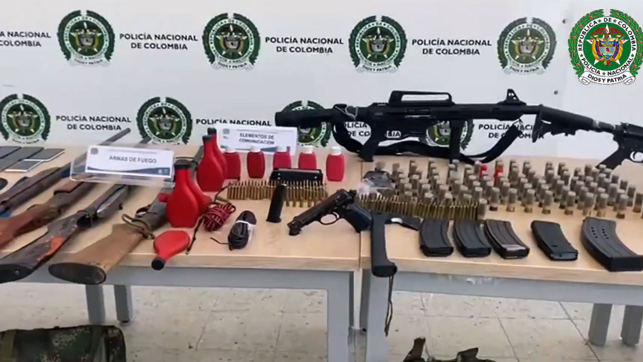 Durante la intervención, las autoridades incautaron un arsenal que incluía siete armas de fuego, un mortero, una rampa artesanal, dos drones, seis proveedores, 188 cartuchos de distintos calibres, 13 brazaletes, ocho metros de cordón detonante, 11 contenedores con pólvora, 50 fulminantes, dos radios, dos binoculares, chalecos balísticos, porta-proveedores y uniformes de uso privativo de las Fuerzas Militares.