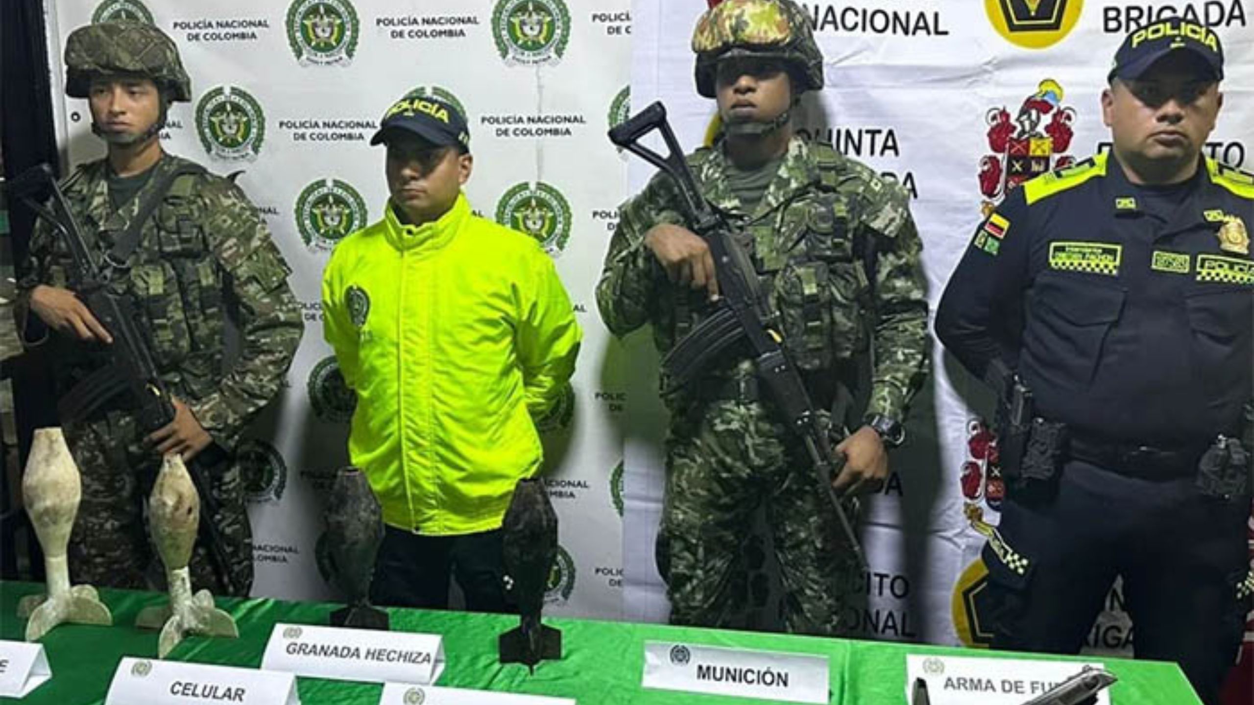 Durante la inspección al lugar de los hechos, las autoridades incautaron una pistola calibre 9 milímetros con munición, cuatro granadas artesanales y equipos de comunicación.