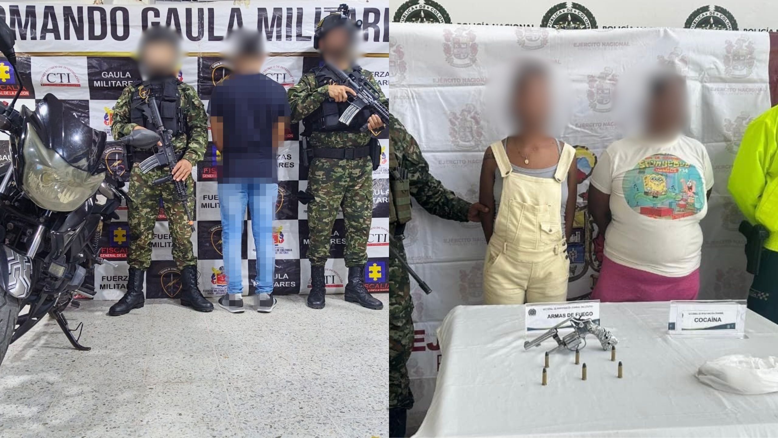 El primer procedimiento se llevó a cabo el viernes 17 de abril, cuando tropas del Batallón de Artillería de Campaña N.° 2, en coordinación con la Sijín, capturaron a dos mujeres por el delito de tráfico, fabricación o porte de armas de fuego y municiones. Durante la operación se incautaron un revólver, seis cartuchos y 50 dosis de sustancias alucinógenas. Las capturadas quedaron a disposición de la autoridad competente.
