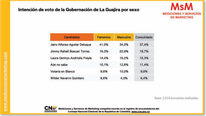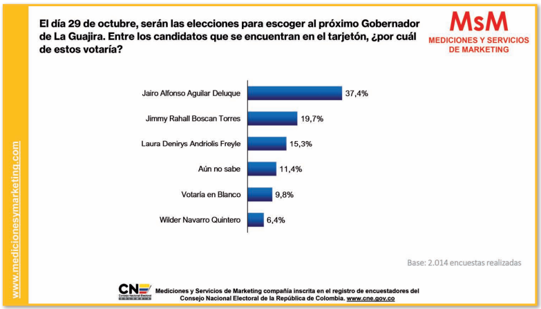La empresa Mediciones y Servicios de Marketing S.A.S. (MsM) entregó los resultados de la reciente encuesta realizada en el mes de septiembre en el departamento de La Guajira, sobre la intención de votos para elegir gobernador el próximo 29 de octubre.