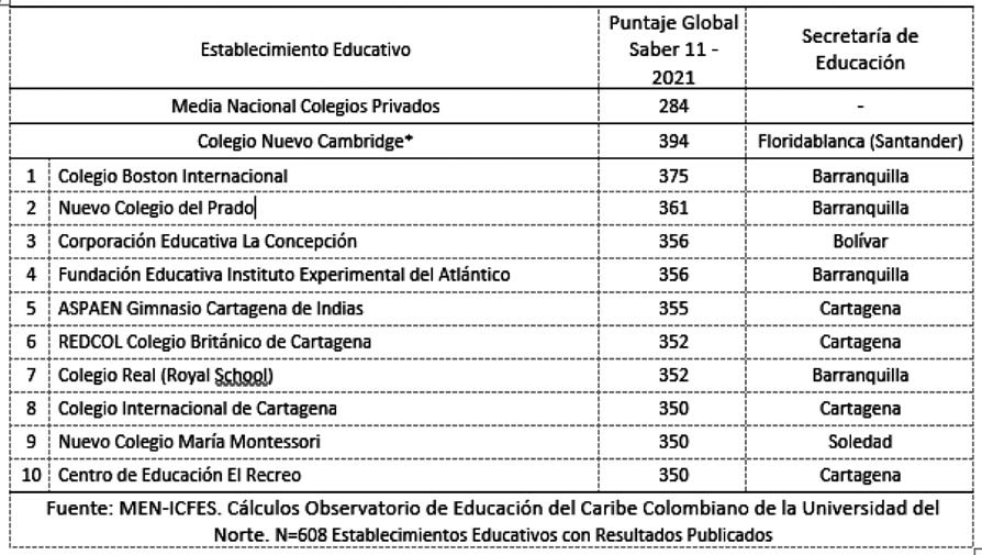 Así mismo, el Observatorio de Educación de la Universidad del Norte dio cuenta de los 10 mejores colegios privados del Caribe. En este análisis, el Colegio Boston Internacional de Barranquilla encabeza la lista como la institución educativa privada con más alto puntaje en las Pruebas Saber de la Costa. Además, los establecimientos privados con mejor resultado se concentran en Barranquilla y Cartagena.