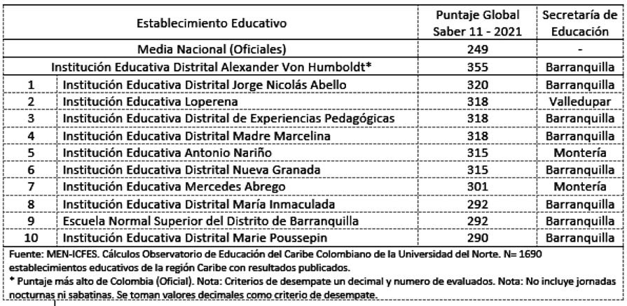 Para realizar la clasificación de los mejores colegios públicos, el Observatorio revisó el puntaje global en las pruebas de 1.690 establecimientos educativos de la región. Al igual que en años anteriores, la Institución Educativa Distrital Alexánder Von Humboldt de Barranquilla fue el colegio oficial de Colombia con el más alto puntaje en esta prueba.