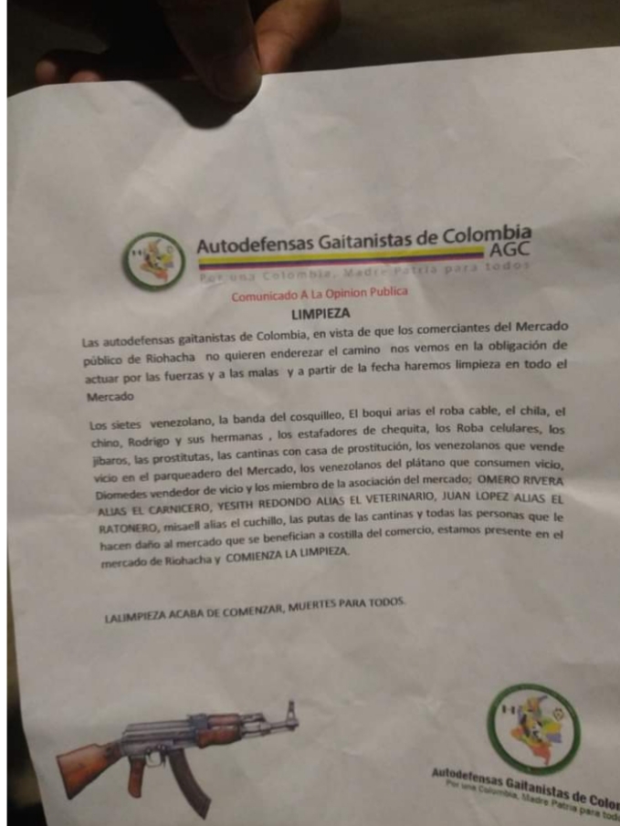 El pasquín está firmado por las Autodefensas Gaitanistas de Colombia, el mismo grupo que intimidó a los militantes de ‘Colombia Humana’ en el departamento de La Guajira.
