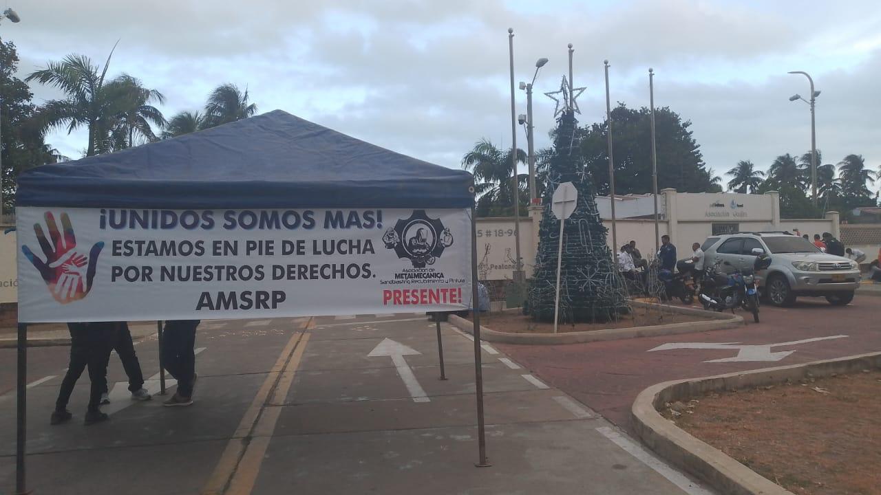 Integrantes de la Asociación Metalmecánica de Sandblasting, Recubrimiento y Pintura mantienen una protesta permanente en las instalaciones de la empresa Hocol, en Riohacha, en reclamo por lo que califican como «incumplimientos en la vinculación de trabajadores locales».