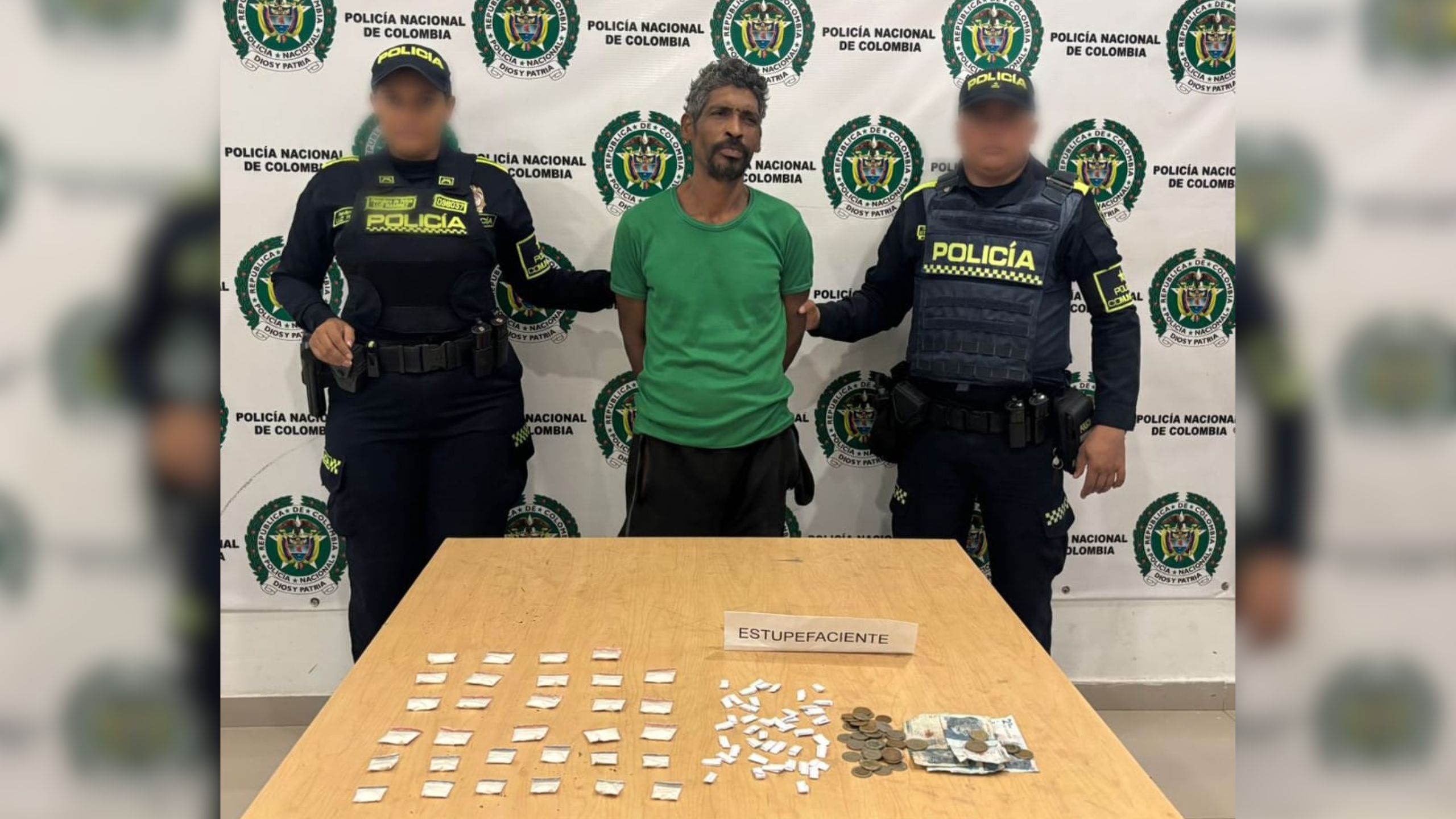 La intervención se produjo en la carrera 8 con calle 14, luego de que comerciantes, a través de la red de apoyo, alertaran sobre la presencia de un individuo vestido con suéter verde y sudadera negra, cuya actitud generaba inquietud entre quienes transitaban por la zona. Al llegar al punto, los uniformados ubicaron a un sujeto con las mismas características, quien intentó huir al notar la presencia policial.