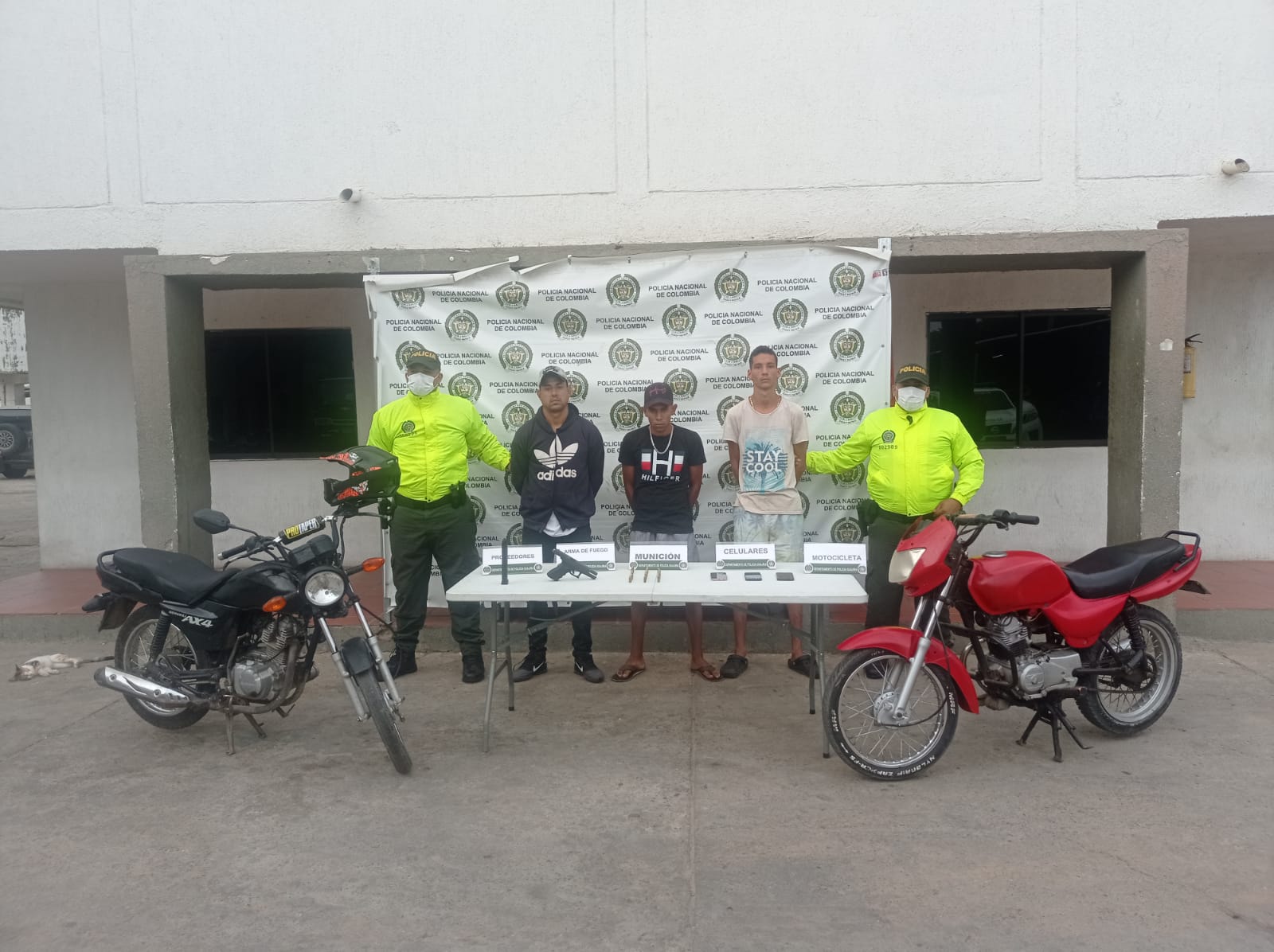 A estos sujetos las autoridades les incautaron una pistola, un proveedor modificado para 31 municiones, 28 cartuchos calibre 9 milímetros, dos motocicletas y tres celulares.
