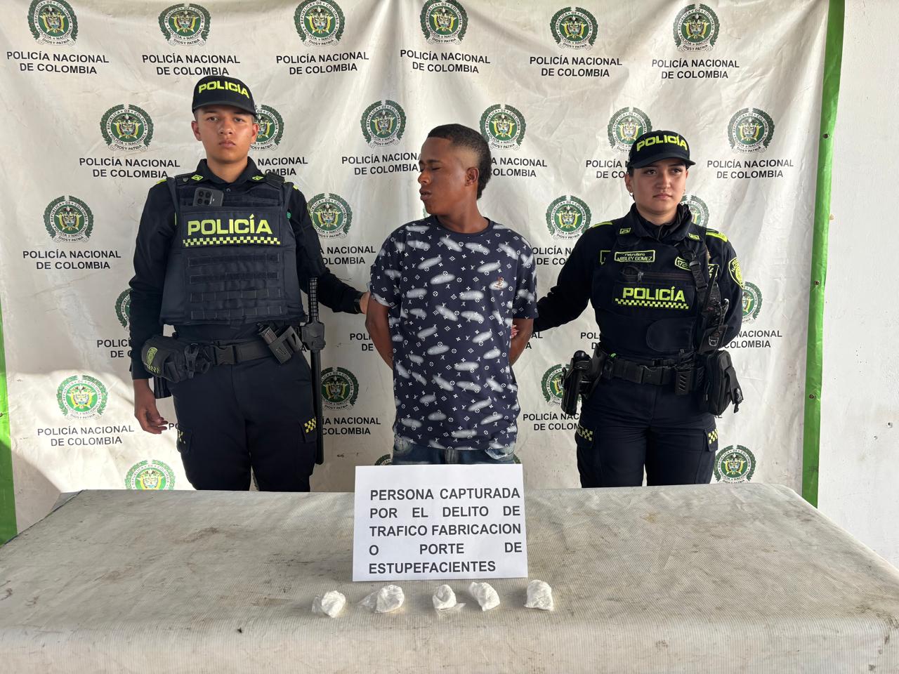 El procedimiento se desarrolló en el barrio Torres de La Majayura, en la calle 29 con carrera 13, donde las autoridades realizaban patrullajes de control territorial. En el lugar fue detenido Saider Manuel Alfaro López, de 26 años, a quien durante un registro personal le fueron encontradas cinco bolsas plásticas que contenían aproximadamente 80 gramos de base de coca.