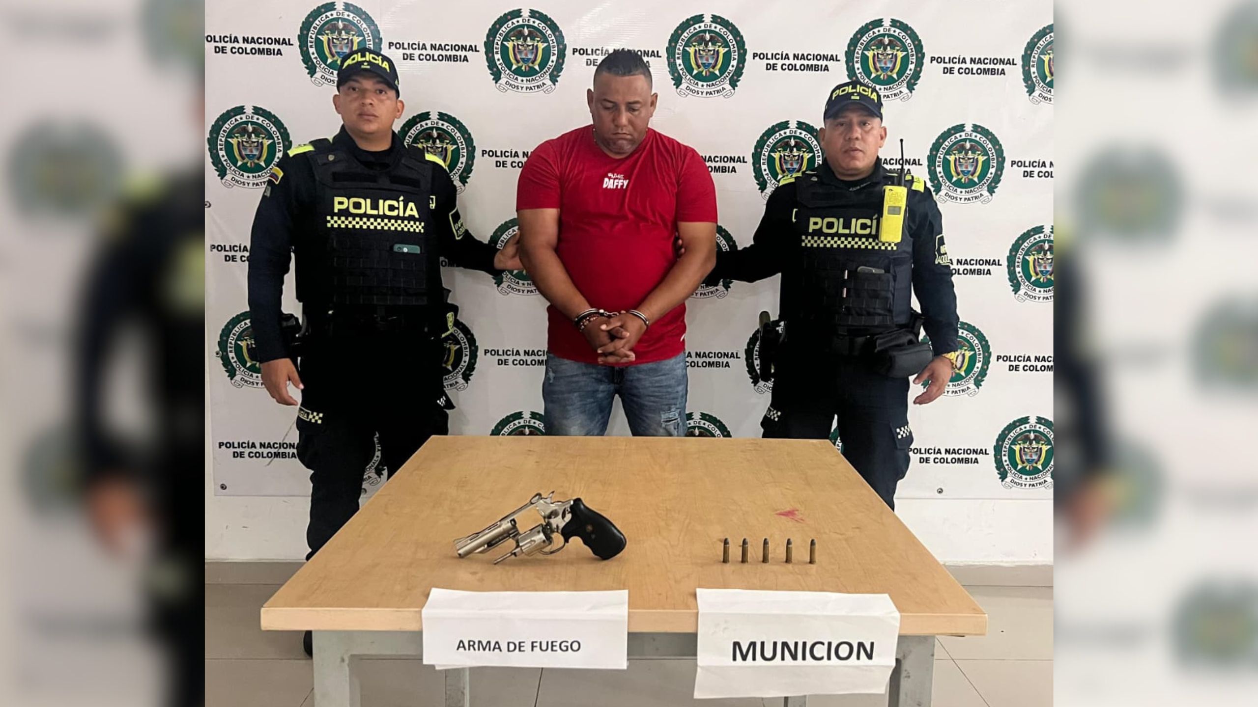 Al ser requerido para presentar la documentación que acreditara la legal tenencia del arma, el hombre manifestó no contar con los permisos exigidos por la normativa vigente, por lo que fue capturado en flagrancia. El detenido fue identificado como Deivis Dibrain Corrales Bermúdez, quien, junto con el arma y la munición incautadas, fue puesto a disposición de la Fiscalía General de la Nación, a través de la URI de turno en Riohacha.