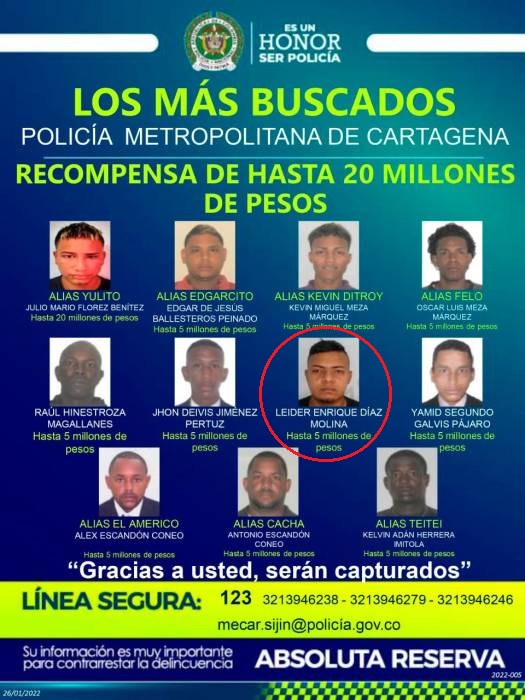 “Por lo que es necesario verificar con la Seccional de Investigación Criminal su plena identificación, quienes confirman que se trata de la persona buscada, por los delitos de homicidio agravado en concurso heterogéneo con fabricación, tráfico y porte de armas o municiones. Asimismo está vinculado al cartel de los más buscados en la cuidada de Cartagena”, dijo la Policía de La Guajira en su reporte oficial.