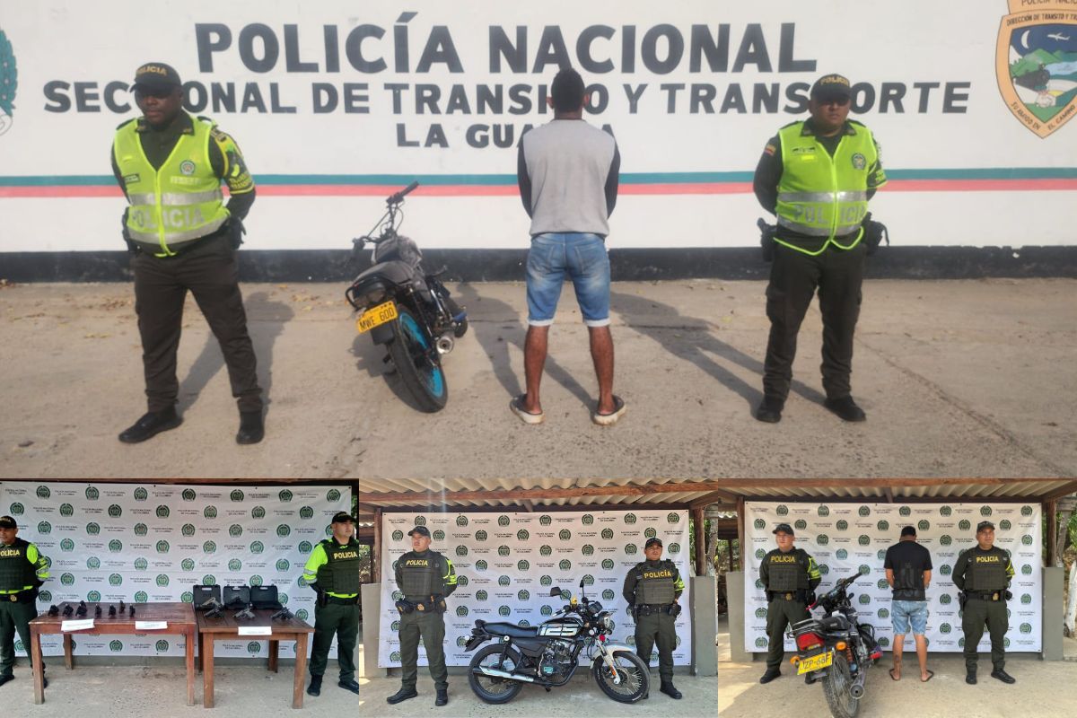 La Seccional de Tránsito y Transporte de La Guajira, capturo a varias personas por los delitos de receptación y falsedad para obtener prueba de hecho verdadero, la incautación de armas de fuego y la recuperación de motocicletas con antecedentes de hurto.