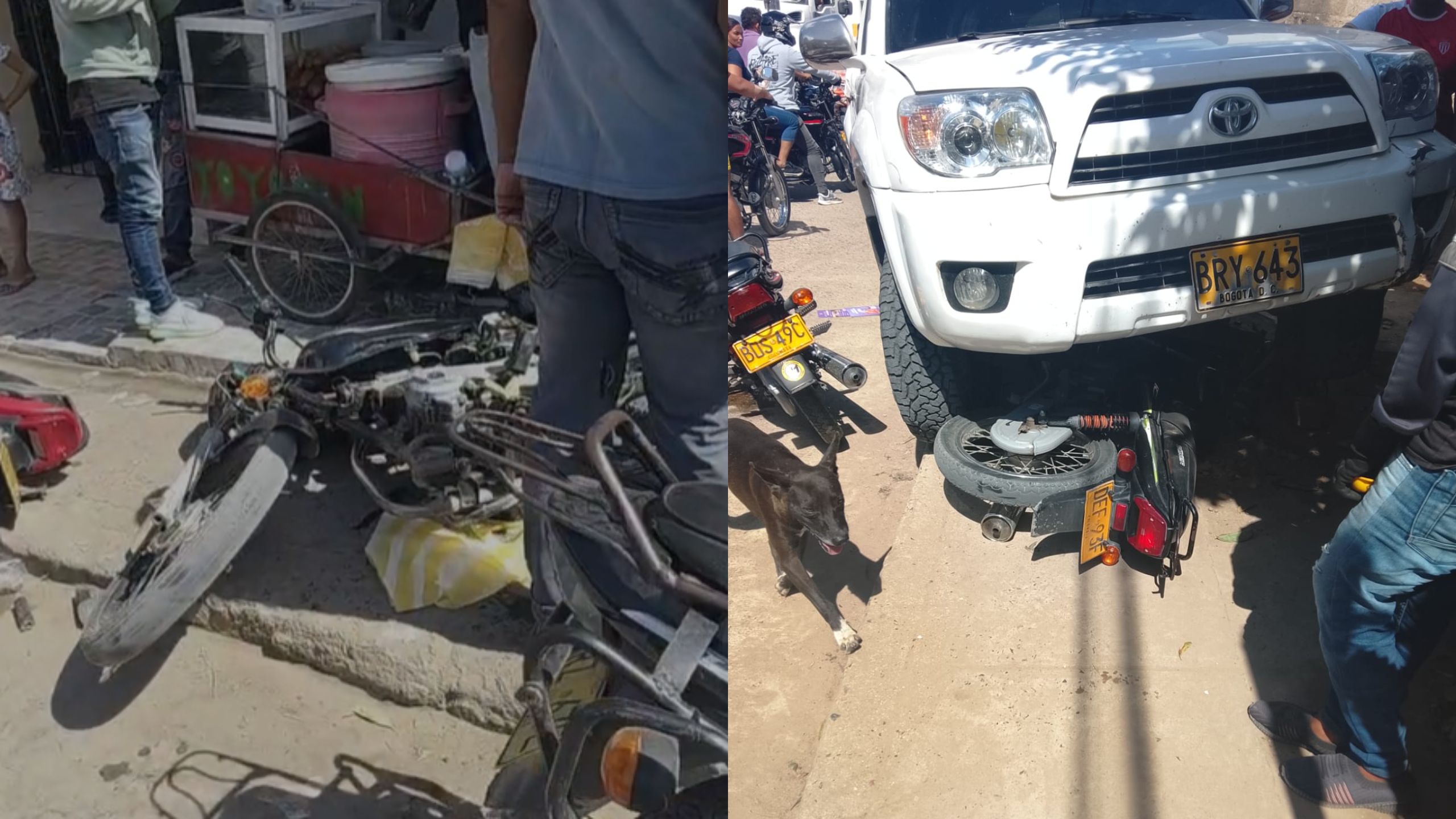 Un aparatoso accidente de tránsito se registró en la tarde de este sábado 20 de diciembre en el barrio Los Olivos, en el distrito de Riohacha, luego de que una camioneta blanca Toyota 4Runner colisionara contra cinco motocicletas que se encontraban estacionadas, sin que se reportaran personas lesionadas.