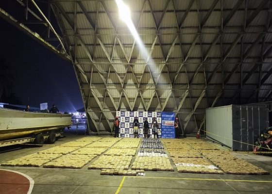 La lancha interceptada era tripulada por tres sujetos extranjeros cuando navegaba en el departamento del Valle del Cauca, transportando en su interior 2.418 paquetes rectangulares con estupefacientes.