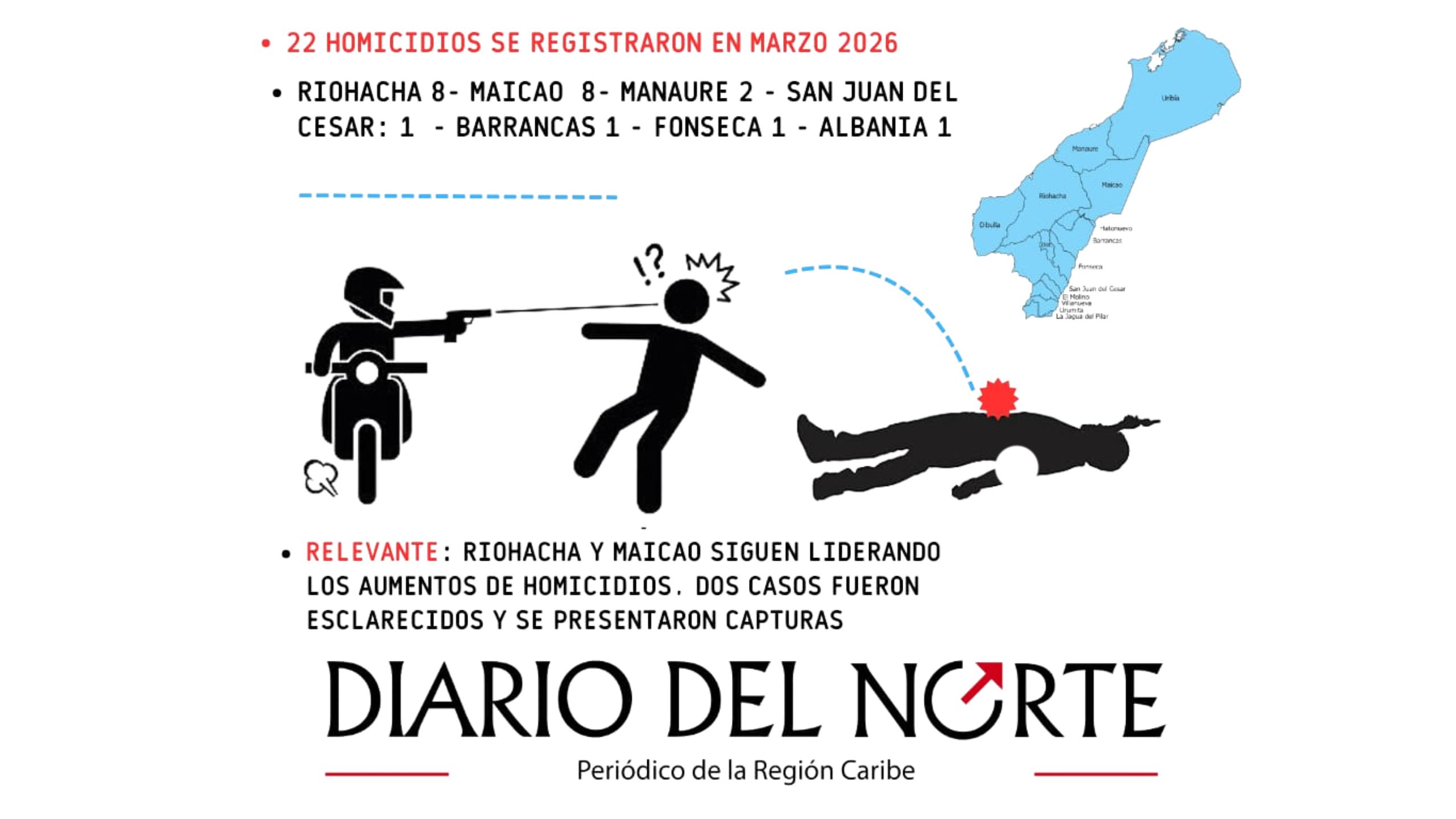De acuerdo con datos recopilados por Diario del Norte, Maicao y el Distrito de Riohacha concentraron los mayores índices de violencia, con ocho homicidios cada uno en ese periodo. Les siguen Manaure, con dos casos, y los municipios de San Juan del Cesar, Fonseca, Albania y Barrancas, donde se reportó un asesinato en cada localidad.