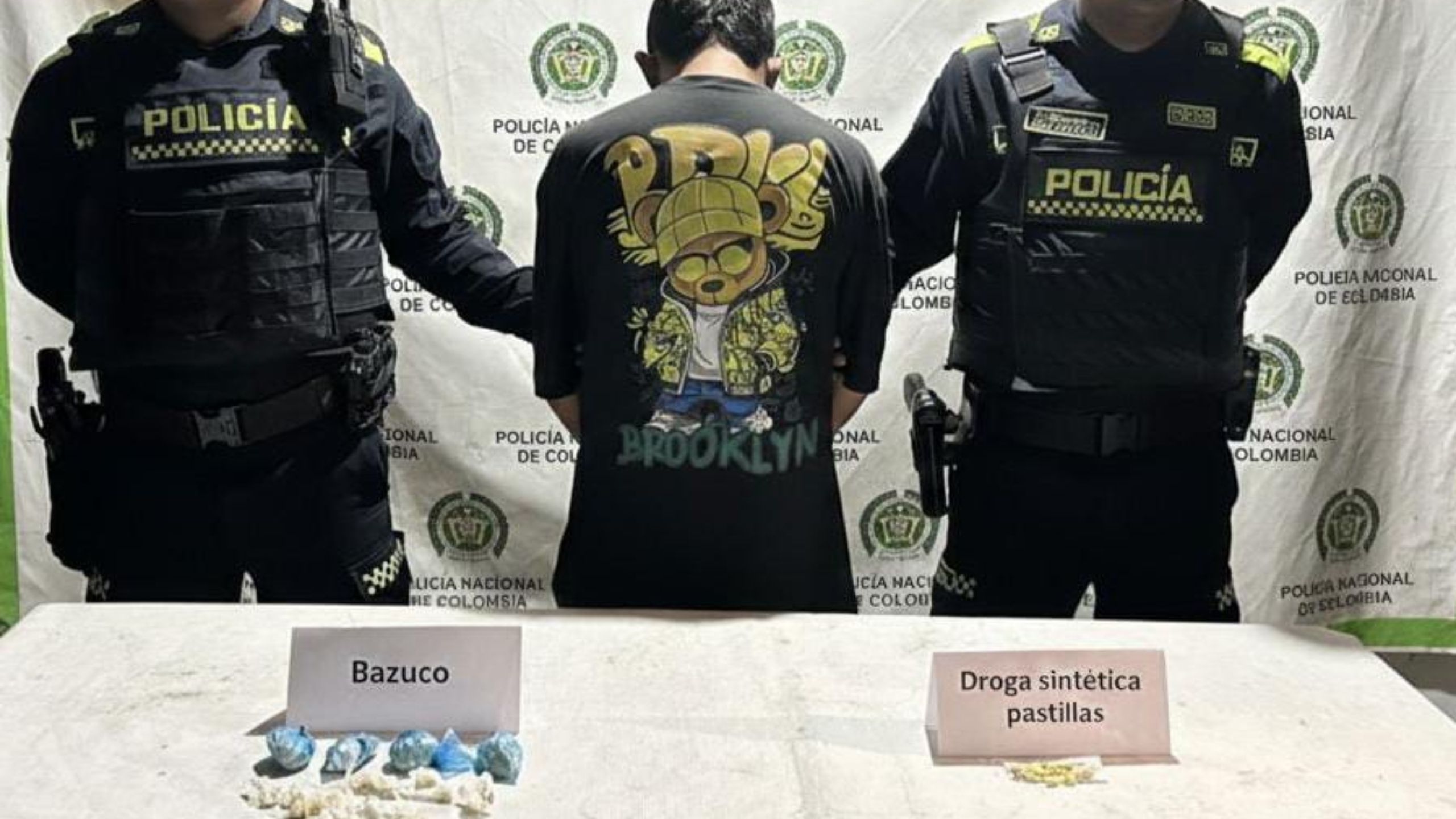 Según el reporte oficial, fueron incautados 56 gramos de base de coca y 19 pastillas con un peso aproximado de 11 gramos. El capturado fue informado de sus derechos y trasladado a la URI, donde quedó a disposición de la Fiscalía General de la Nación.