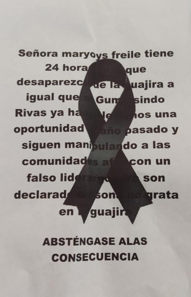 Decía la amenaza, que tanto la líder como el profesor Gumersindo Rivas, tenían 24 horas para desaparecer del departamento de La Guajira. “Ya le dimos una oportunidad el año pasado y siguen manipulando a las comunidades con un falso liderazgo, son declaradas personas no gratas en La Guajira”.