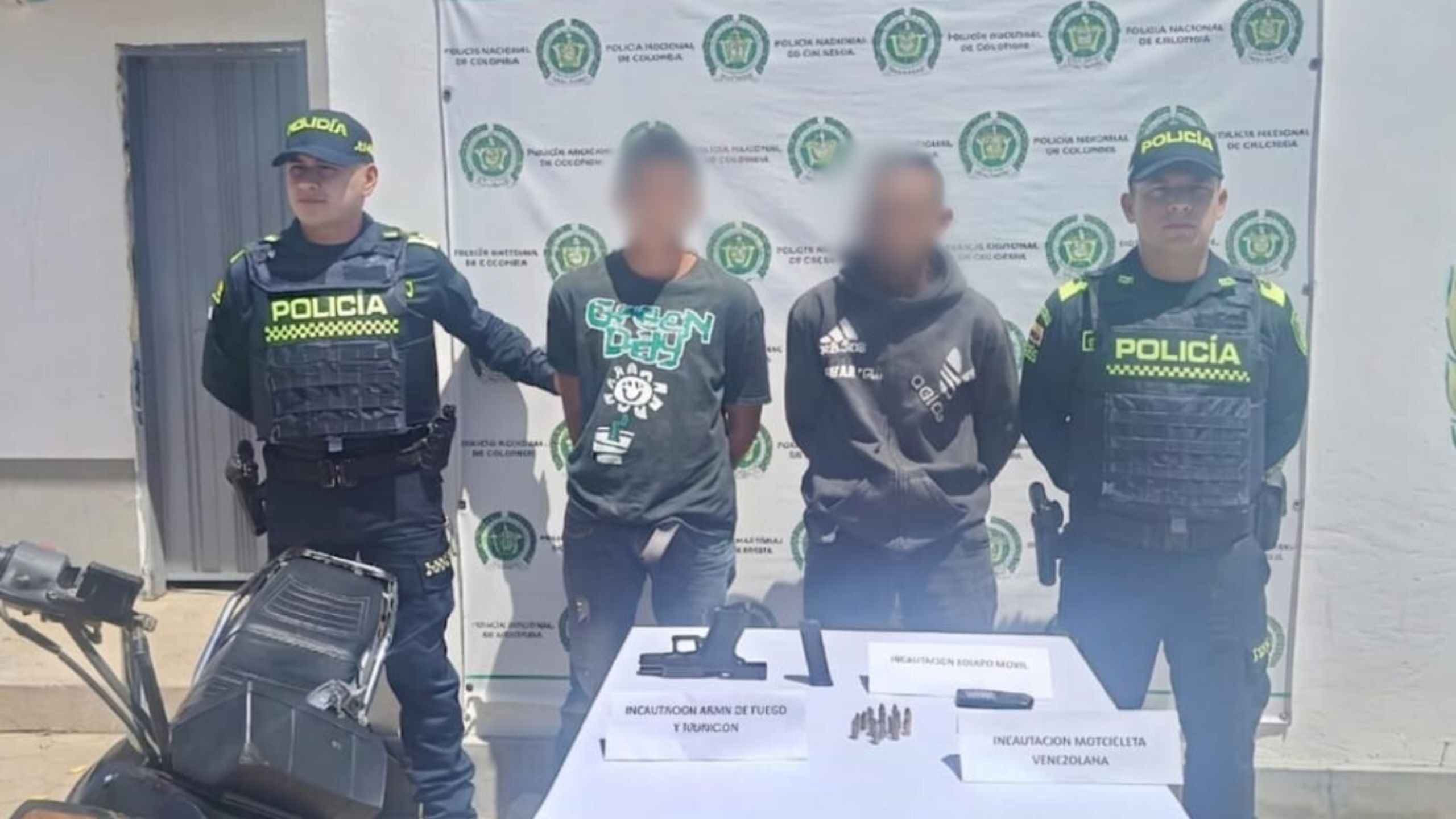 El procedimiento se llevó a cabo durante labores preventivas en una vía de esta localidad, donde los sospechosos se movilizaban en una motocicleta. Durante la intervención, los policías incautaron una pistola marca Glock 19, un proveedor con 15 cartuchos calibre 9 milímetros, además de un teléfono celular y la motocicleta en la que se desplazaban.