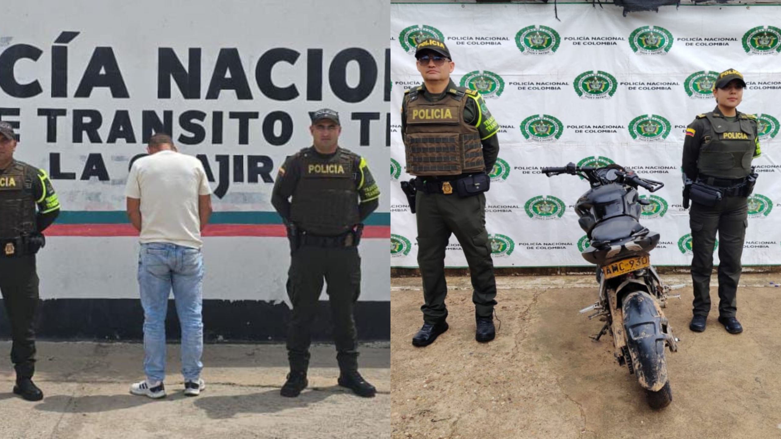 En otro procedimiento, efectuado en el kilómetro 61 de la vía Riohacha–Paraguachón, uniformados del cuadrante vial N.º 4 recuperaron una motocicleta Bajaj Pulsar 200 NS, modelo 2014, color negro y placa AMC93D, que tenía reporte activo por hurto violento ante la Fiscalía 166 de Medellín.