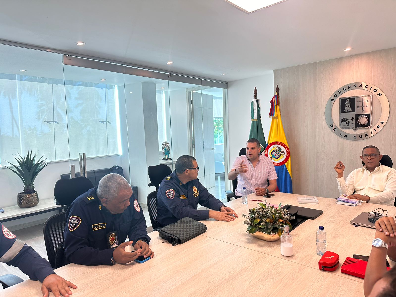 Ante una mesa de trabajo adelantada en el palacio de La Marina, el gobernador (E) de La Guajira, Enrique Freyle y el secretario de Gobierno, Alberto Mario Cuan, escucharon atentamente las inquietudes y solicitudes de los diferentes cuerpos de bomberos de los municipios que asistieron a este encuentro con las máximas autoridades del departamento para evaluar las acciones ante los fenómenos ambientales que afrontaría el país.
