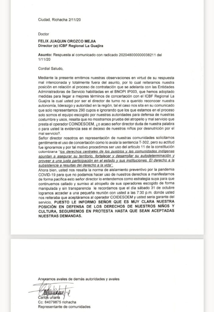 Esto, tras reunirse el sábado 31 de octubre con el director (e) del Icbf Regional La Guajira, Félix Joaquín Orozco Mejía, y no llegar a una concertación, tal como lo avala la sentencia T-302 reconociendo su autonomía, liderazgo y autoridad en la región.