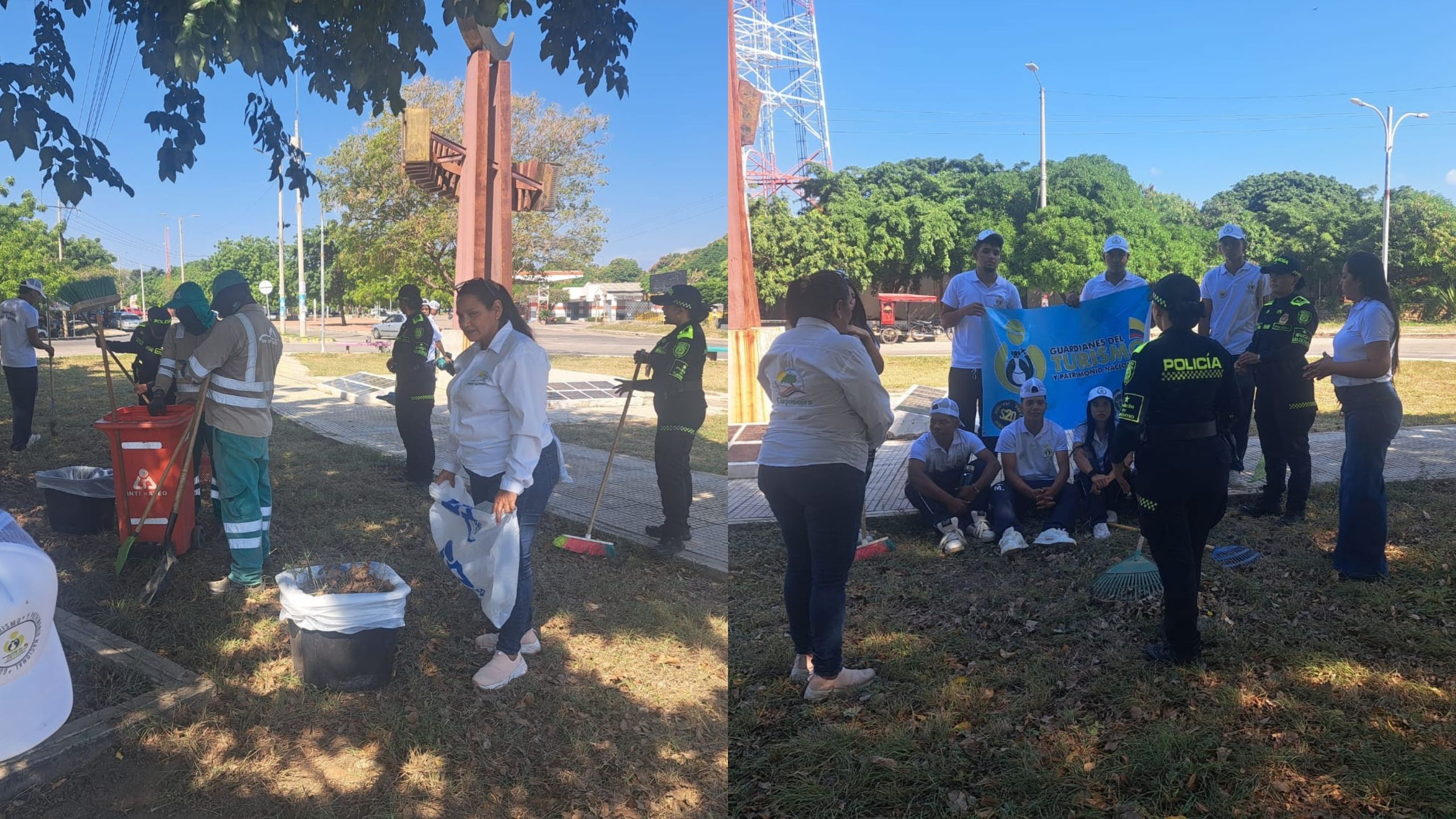 La jornada fue liderada por la Policía Nacional y contó con la participación articulada de Corpoguajira, la Secretaría de Desarrollo Económico, el enlace de Turismo y estudiantes del Grupo Guardián del Turismo de la Institución Educativa María E. Mendoza.