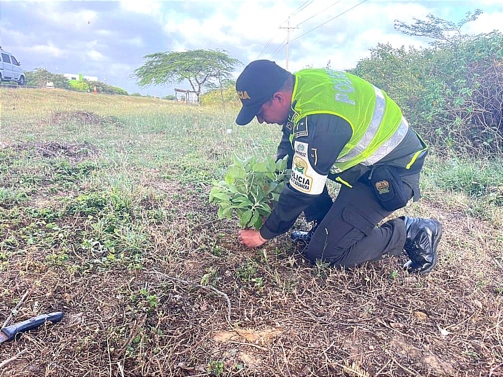 Los uniformados de la Polfa en los municipios de Maicao y Hatonuevo tomaron la iniciativa de realizar una jornada de siembra cuidadosa de árboles, con el objetivo de generar conciencia en la sociedad sobre la importancia de garantizar una protección duradera del planeta y sus recursos naturales.