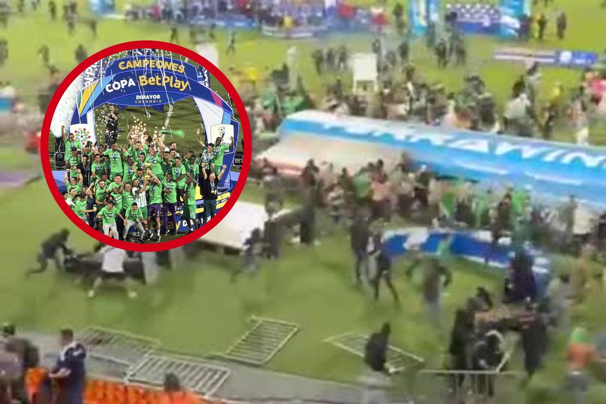 La final de la Copa BetPlay 2025 entre Atlético Nacional y el Independiente Medellín terminó en caos como lo muestran vídeos compartidos en redes sociales. Tras el pitazo final, hinchas invadieron la cancha del estadio Atanasio Girardot, protagonizando enfrentamientos, lanzamiento de objetos y daños en las tribunas, lo que obligó a la intervención inmediata de la Policía Nacional.