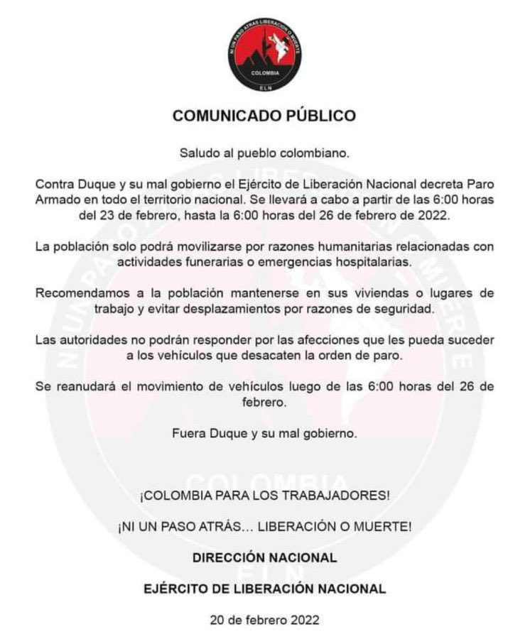 En el documento, el grupo subversivo señala que para protestar “Contra Duque y su mal Gobierno, el Ejército de Liberación Nacional decreta paro armado en todo el territorio nacional. Se llevará a cabo a partir de las 6:00 horas del 23 de febrero, hasta la 6:00 horas del 26 de febrero de 2022”.