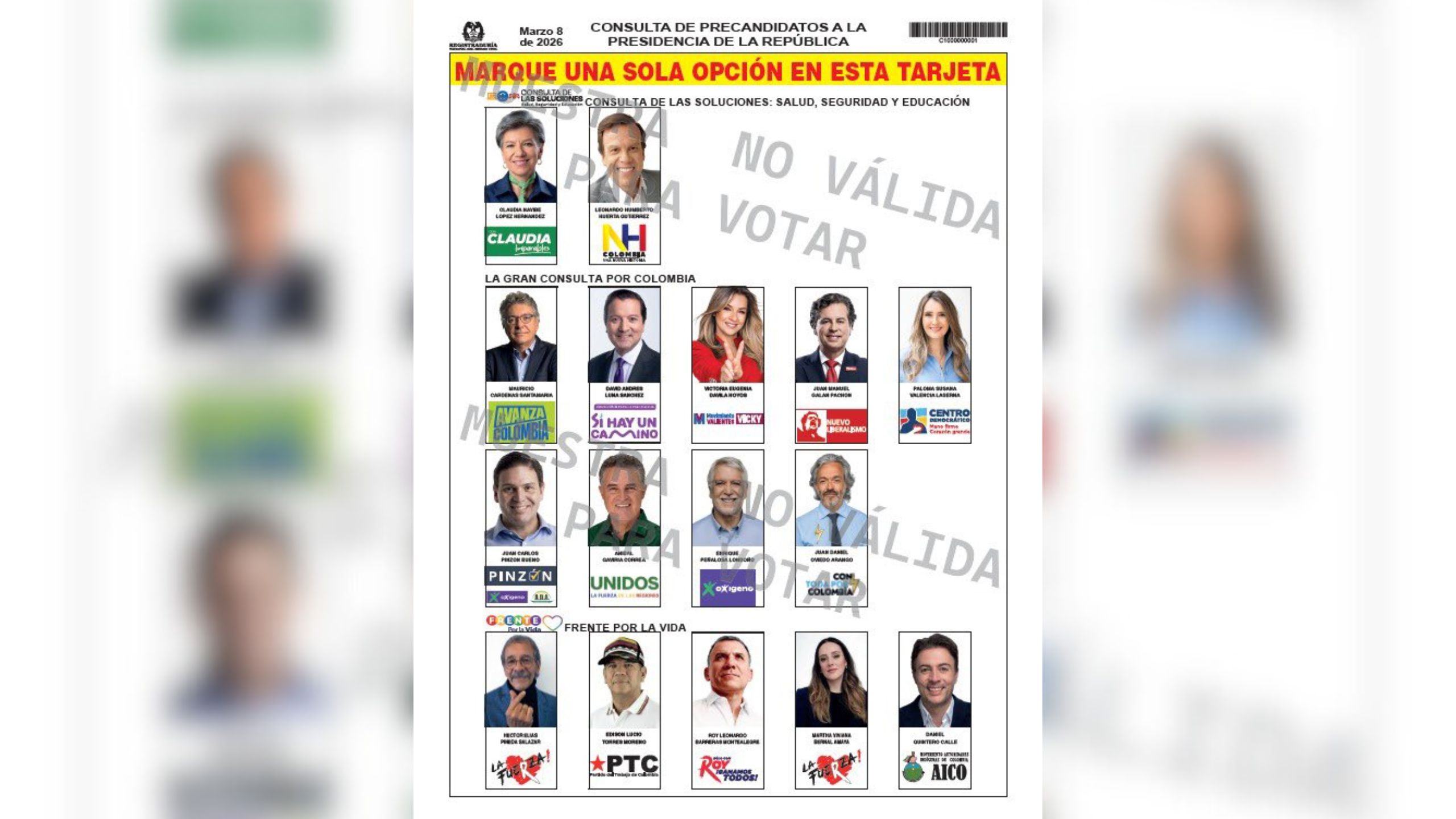 La Registraduría Nacional del Estado Civil definió este jueves la ubicación de las consultas interpartidistas y de los precandidatos presidenciales en la tarjeta electoral que será utilizada en las consultas del próximo 8 de marzo.