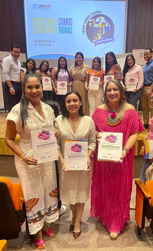 Por otra parte, en el Foro Mujeres por la Integración realizado por el Programa Integra – Oportunidades sin Fronteras de Usaid, dirigido por Leonardo Pérez Arias, la directora ejecutiva de la Fundación Compartamos la Felicidad, moderó el panel ‘Prosperidad con Ellas: Empoderando con Integridad’, en el que participaron, la gobernadora de La Guajira, Diala Wilches, la directora de Desarrollo Empresarial y Cooperación de la Alcaldía Distrital de Riohacha, Ivette Pinedo Pabón; la docente y emprendedora social venezolana, Nathaly Peña Ruiz y la comunicadora y emprendedora María Tabares Colmenares de Antojitos Río.