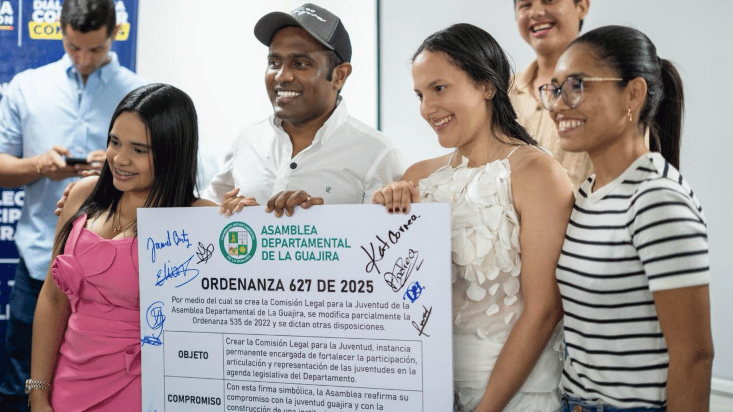 Tras la aprobación, se realizó un acto simbólico de firma en Riohacha, que contó con la presencia de la presidenta del Consejo Departamental de Juventud, Valeria Escobar, y la presidenta de la Plataforma Departamental de Juventud, Katerin Mora. También participaron la directora de Cultura, Género y Juventud del departamento, Seidy Obregón, y la gestora social, Sara Daza, quienes resaltaron la importancia de abrir espacios que garanticen la inclusión y el liderazgo juvenil.