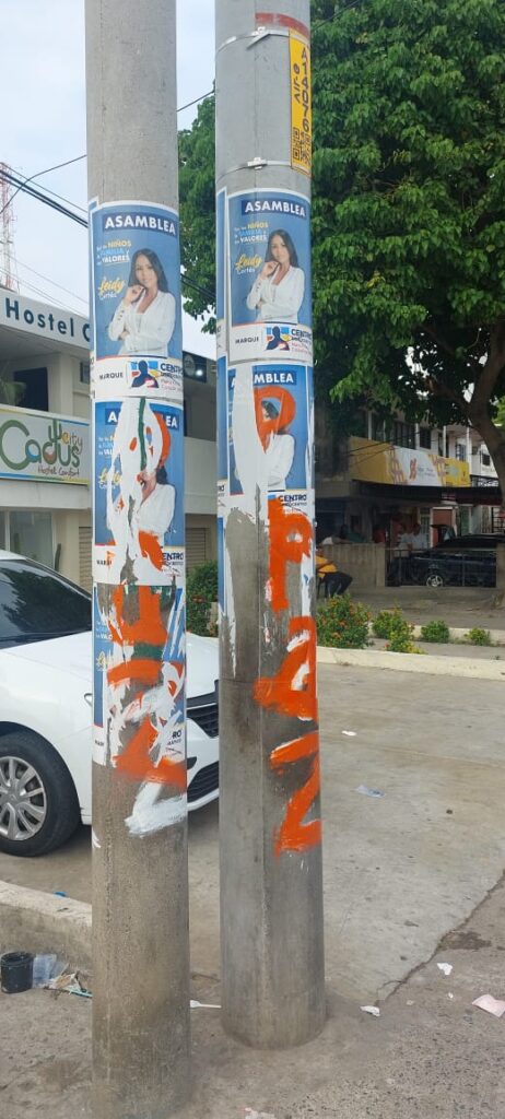 La aspirante a la duma departamental por el partido Centro Democrático, Leydi Cortés, denunció la vandalización de las piezas publicitarias de su campaña, en varias de estas su cara fue tachada y otras marcadas con la palabra ‘paz’.